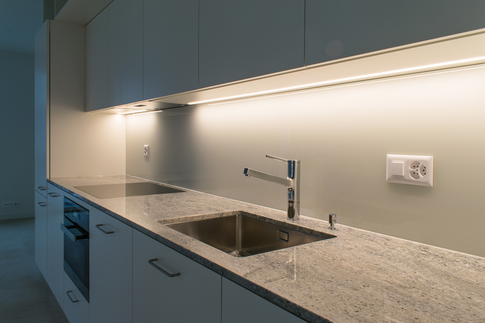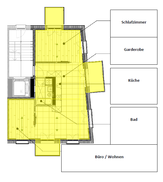 Beim Ausbau wurden die besten Materialien verbaut. Im Wohn-/Ess-/Eingangsbereich sowie im Bad wurden Feinsteinzeugplatten verlegt, in den beiden Zimmern Kieferparkett geölt. In der Küche wurden neben einer Granitabdeckung Geräte von Miele eingebaut. Es gibt einen Induktionsherd, Geschirrspüler, Backofen und eine Kühl-/Gefrierkombination. Sehr nützlich sind auch die vielen Einbauschränke.